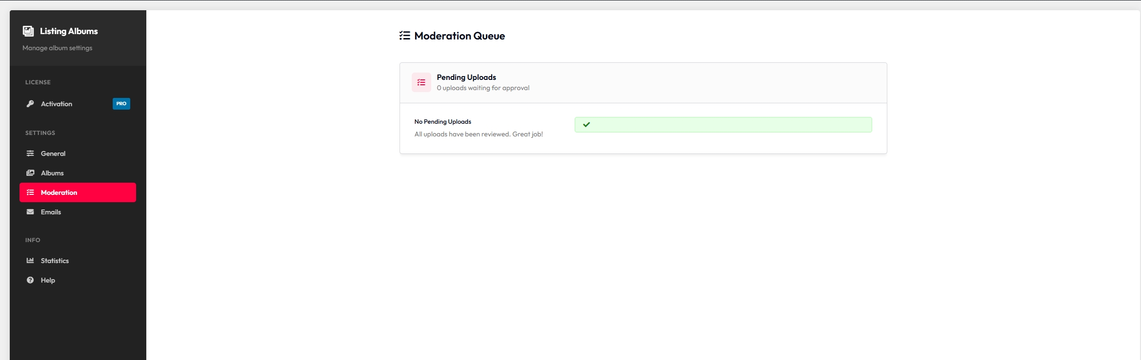 - Modern admin UI with dedicated dashboard (License, Settings, Albums, Moderation, Emails, Statistics, Help)